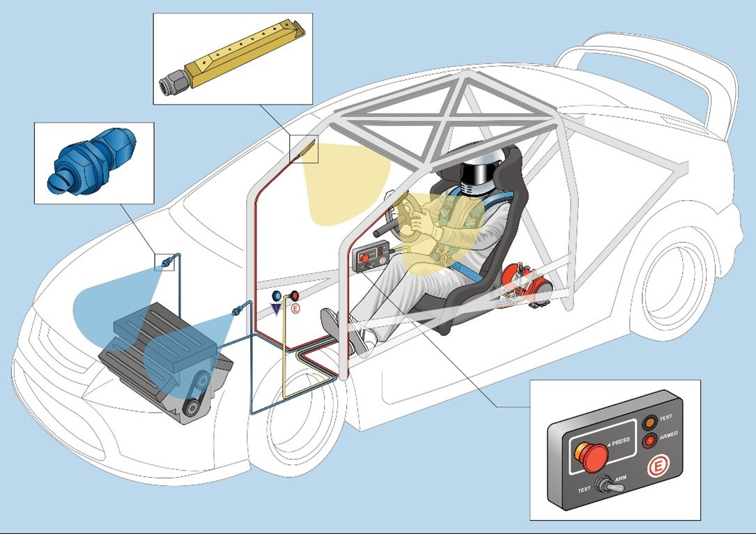 An automatic fire suppression system in a race car is a critical safety subsystem designed to detect and extinguish fires rapidly, minimizing risk to the driver and preventing catastrophic damage. Typically integrated into high-performance motorsport vehicles governed by organizations such as the Fédération Internationale de l'Automobile, the system consists of a pressurized cylinder filled with a fire-extinguishing agent (commonly foam, gas, or clean agents like Novec 1230), a network of strategically placed nozzles, heat-sensitive or electrically triggered activation mechanisms, and control circuitry. When a fire is detected—either automatically through thermal sensors or manually via a driver-activated switch—the system releases the extinguishing agent through nozzles directed at high-risk areas such as the engine bay, fuel tank, and cockpit. The agent works by cooling the fire, displacing oxygen, or interrupting the chemical reaction of combustion. These systems are engineered to operate effectively under extreme conditions, including high speeds, vibrations, and impacts, ensuring rapid discharge within seconds. Additionally, modern systems are lightweight, compact, and compliant with strict motorsport safety regulations, making them an essential component in protecting both driver and vehicle during racing incidents.
